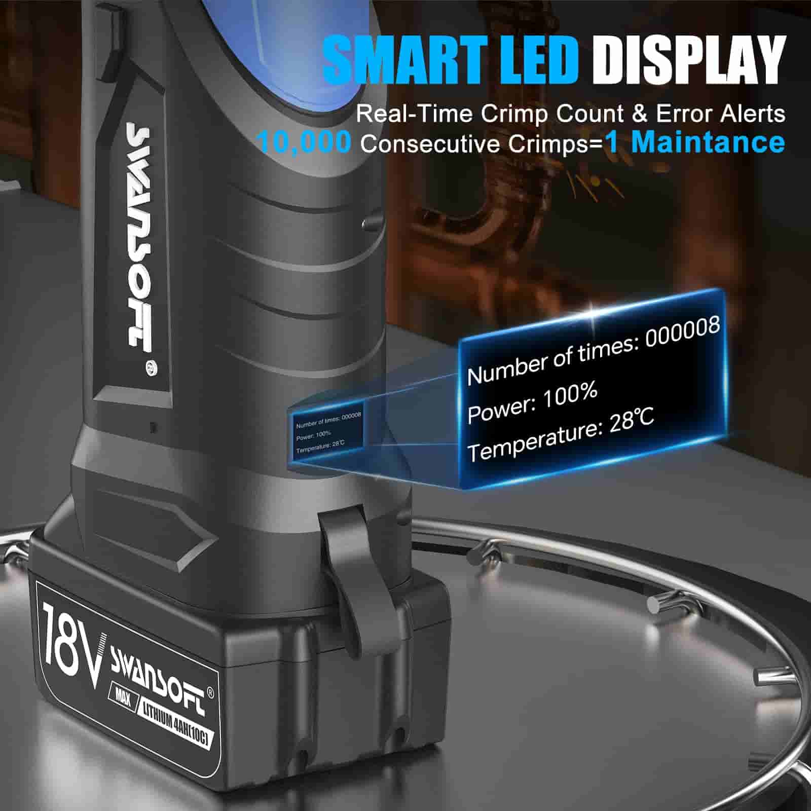 - 【Dual-Battery & Smart OLED Display】Copper press tool includes 2pcs 4.0Ah 18V high-capacity batteries that easily support all-day high-intensity operation. The exclusive OLED display supports English language options, providing real-time tracking of crimp counts, battery level, and temperature. The control system, refined over a decade of field validation and optimization, ensures outstanding stability and reliability. The included charger features quadruple protection—over-current, over-temperature, under-voltage, and over-load—for safe and efficient charging.