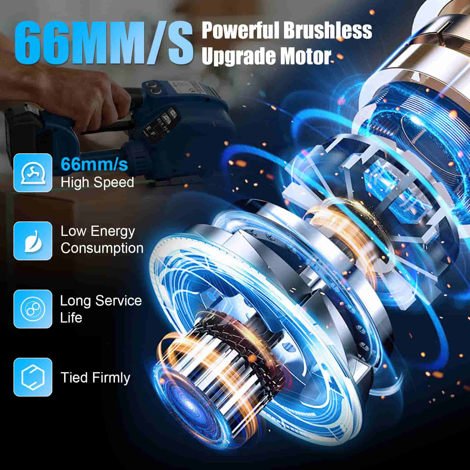 - High-Performance Brushless Motor: This electric strapping machine with a strapping speed of 66mm/s and a powerful 2100N maximum tension. At the core of this electric banding tool lies an advanced brushless motor, ensures longer service life, reduced maintenance, and consistent high-power output