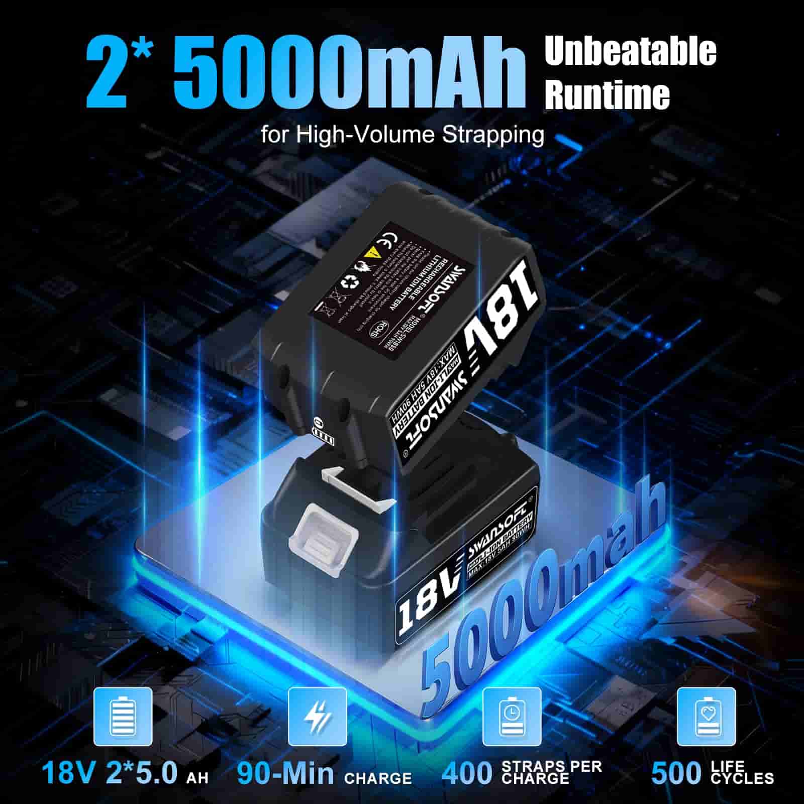 - 400 Straps: This electric strapping machine is equipped with two 5000mAh batteries that can be swappedseamlessly. With a rapid 90-minute full charge, each battery supports up to 400 straps and withstands500 cycles and significantly improving workflow efficiency in high-demand environments.